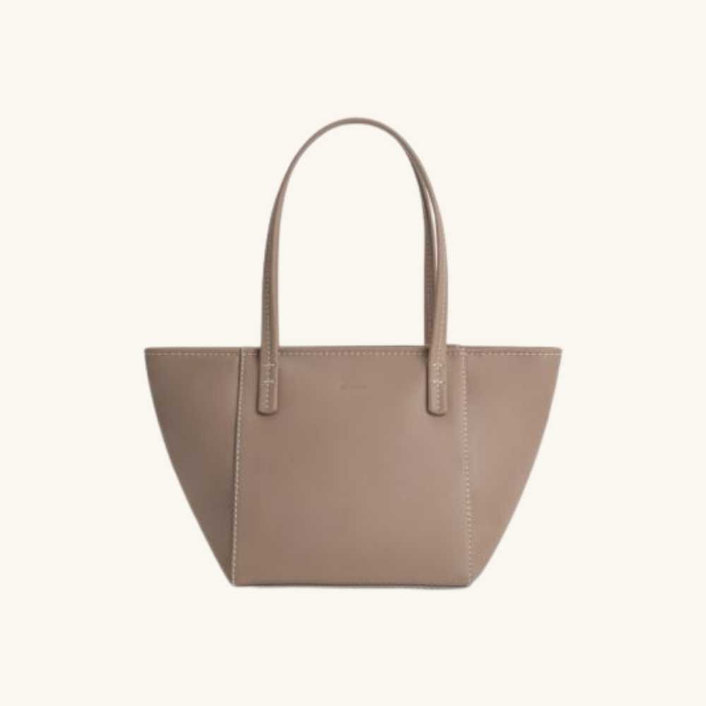 Una tote pequeña y minimalista en tono taupe, elaborada en piel suave con el diseño limpio que caracteriza a By Far. Perfecta para llevar lo esencial con estilo refinado.