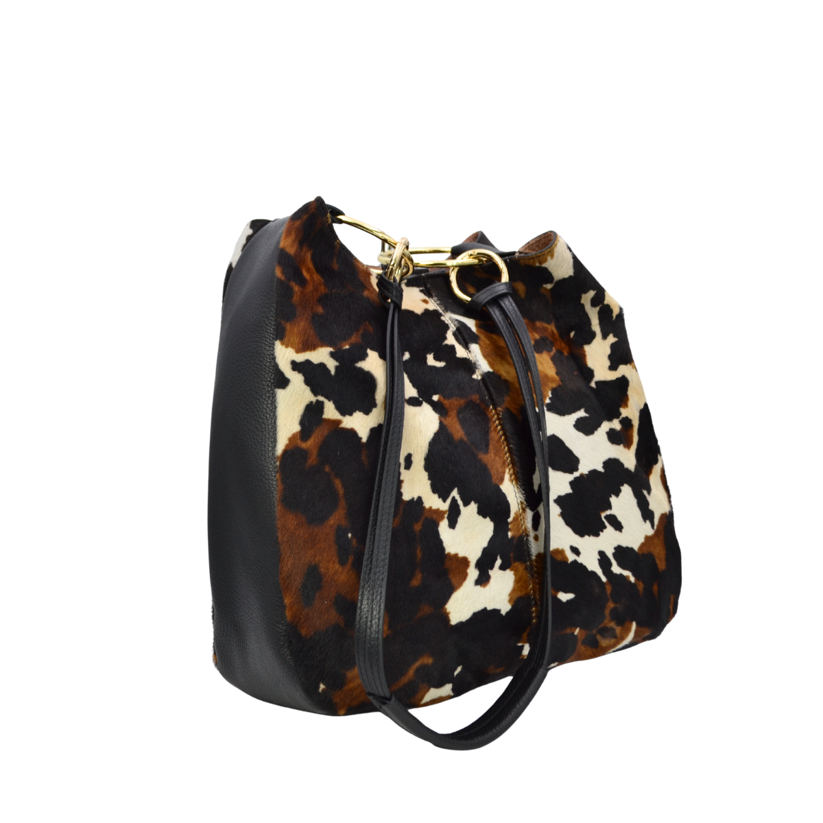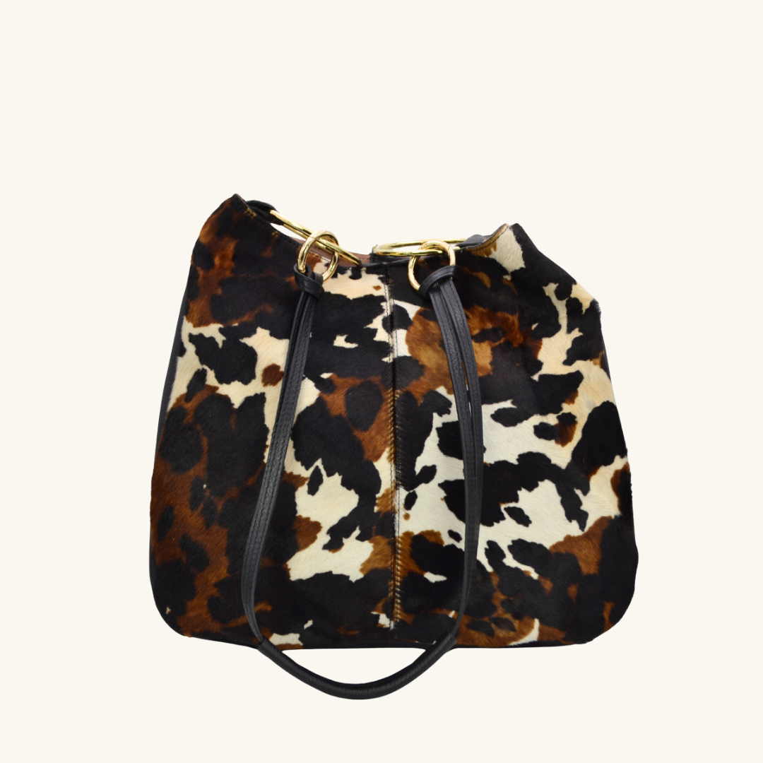 El bolso Lia Poni Cow de Claudia Firenze está elaborado en 100% cuero de becerro de origen italiano, destacando por su textura suave y su acabado de alta calidad que refleja la excelencia artesanal de la marca.