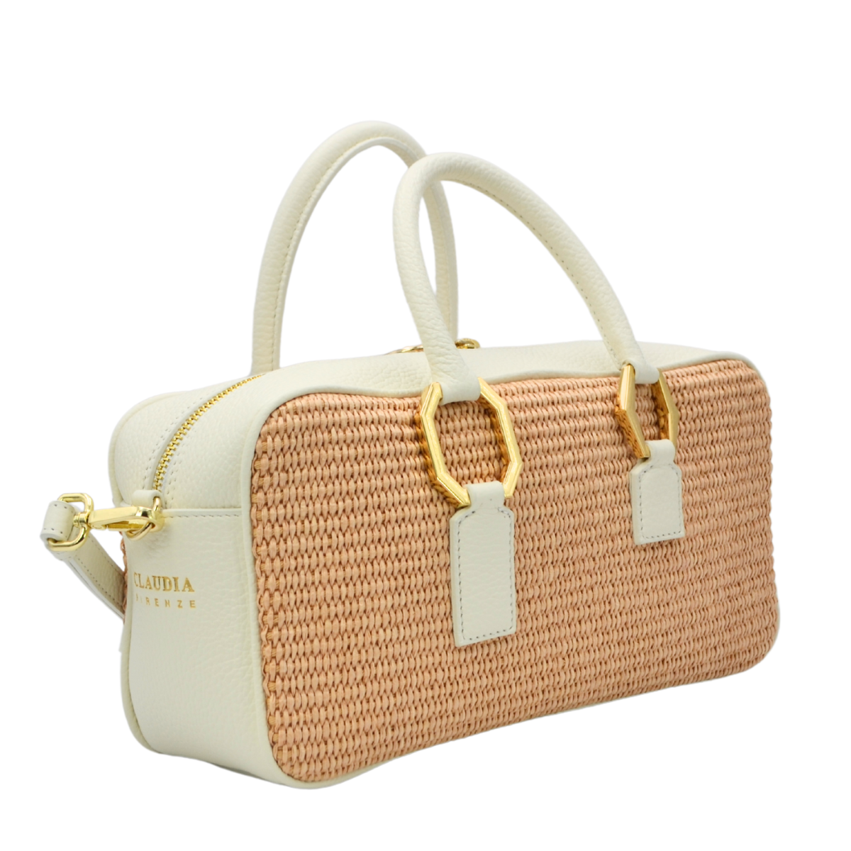 El bolso Lulú Straw de Claudia Firenze destaca por su diseño ligero y femenino, con un cuerpo en tejido tipo rafia que aporta frescura y naturalidad, complementado con detalles en cuero de origen italiano que reflejan la tradición artesanal de la marca.